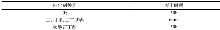结果显示,固化反应中不加催化剂,表干时间 5 0 h ,当加入二月桂酸二丁基锡时,表干时间为6min,二月桂酸二丁基锡的加入明显加快了反应速度。当用钛酸正丁酯作为催化剂时,催化剂的少量加入使反应迅速成为蜂窝状,这是由于钛酸正丁酯直接与基础胶α, ω 二羟基聚二甲基苯基硅氧烷发生交联反应,反应速度快造成的;继续搅拌,蜂窝状消失,表干时间 50h ,说明少量的钛酸正丁酯在该体系中参与反应,但是不能降低反应的活化能,对反应速率几乎不起作用[5]。因此,二月桂酸二丁基锡作为催化剂,催干效果最好。