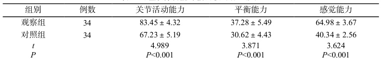 观察组患者接受早期康复护理。首先是早期心理干预,大部分患者会因为自身肢体功能的丧失而产生失望、抑郁的负面情绪,这不利于患者积极配合治疗,无法最大化实现临床治疗效果。所以,医护人员需要及时发现并协助患者发泄内心的负面情绪,可以利用听歌、聊天以及观影的方式转移患者注意,消解其内心的不良情绪;其次是早期体位护理,通常选用坐位、半卧位以及患侧卧位为患者的常用体位。需要注意的是患者体位调整过程中不能出现腕关节弯曲、过度拉扯等问题;最后是肢体功能锻炼,鼓励家属配合患者进行早期的肢体功能锻炼,指导患者下肢保持自然屈伸,帮助其移至床边并使躯干向患侧旋转,根据患者控制能力选择侧手握体进行摆动,从而提高坐姿平衡度。