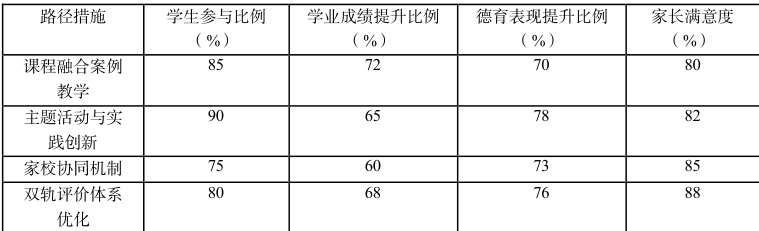 调查数据显示,课程融合案例教学与主题活动实践创新两种路径的学生参与度最高,参与比例分别达到 85% 和 90% ;德育表现提升方面,主题活动实践创新与双轨评价体系优化的实施效果最为显著,提升比例分别达到 78% 与 76% ,家校协同机制在学业成绩提升比例上相对较低,但在家长满意度调查中表现突出,满意度超过 85% 。