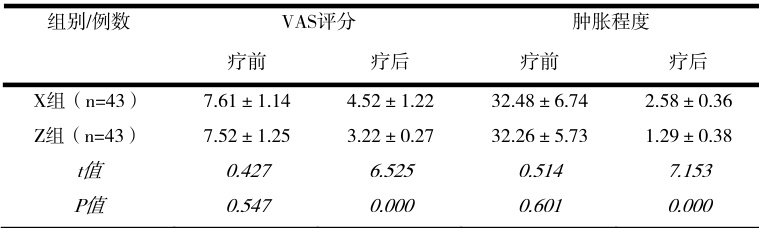 疗前,X组与Z组VAS评分、肿胀程度差异小 (P>0.05) ;疗后,X组与Z组VAS评分、肿胀程度皆有改善,Z组更优 (P<0.05) 。见表2: