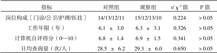 纳入2024 年1—12 月工作日时段在本院完成的标准化查询任务共 100 例,来源包括公共卫生科、家庭医生团队、门诊挂号与收费窗口、护理站与医技科室,纳入对象为承担查询任务的一线工作人员,要求近三个月内固定在岗且具备基本计算机操作能力,排除新入岗不足两周或正在参加脱产培训者,采用随机数字表将任务分配至对照组与观察组各50 例,两组在岗位构成、工作年限、计算机自评能力与日均查询量等方面差异均无统计学意义.