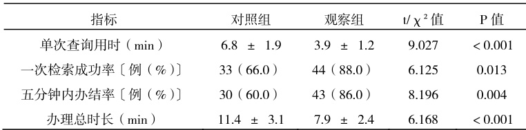 观察组在单次查询用时、一检成功与五分钟内办结率方面优于对照组,办理总时长明显缩短,见表2。