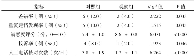 观察组差错率与投诉率更低,满意度评分更高,过程指标亦显著改善,见表 3AA