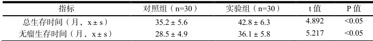 由表 1 可知,实验组的总生存时间和无瘤生存时间均长于对照组( P<0.05)⋅⨀