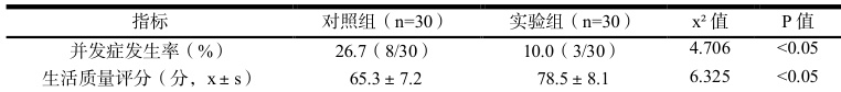 由表 2 可见,实验组的并发症发生率低于对照组,生活质量评分高于对照组( P<0.05) )。