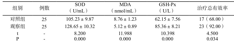 观察组患者治疗总有效率更高,且各项氧化损伤相关指标更优,对比 P(0.05) ),如表 1