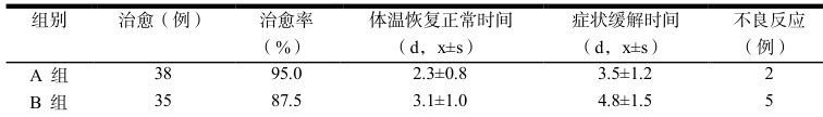 80 例恙虫病患者,分为 A 组(40 例,采用多西环素治疗,成人首次 0.2g,以后每次 0.1g,每日 2次,口服,儿童每日 4mg/kg,分 2 次口服)和 B 组(40 例,采用氯霉素治疗,成人每次 0.5g,每日 4 次,口服,儿童每日 50mg/kg ,分 4 次口服),对比两组疗效,具体数据如下表 1 所示。