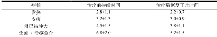 表 2 治疗前后患者症状改善情况(x±s,d)