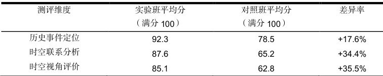 数据显示,实验班学生在历史事件定位、时空联系分析与时空视角评价三个维度的表现均显著优于对照班,说明情境重构策略能有效培育学生的时空观念素养。