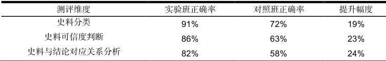 课后对实验班与对照班学生的“史料实证能力”进行测评,测评内容包括“史料分类”“史料可信度判断”“史料与结论的对应关系分析”三个维度,结果如下: