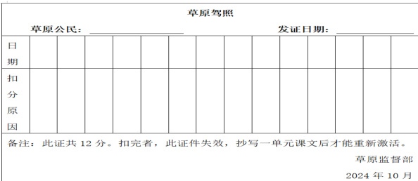 我认为,遵守班规就如遵守交规一般,它既是活动开展的保障又是规范。所以,在我的指导下,班长设计了这张“草原驾照”(见下图)。