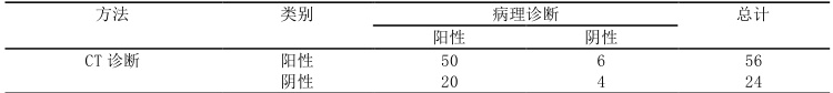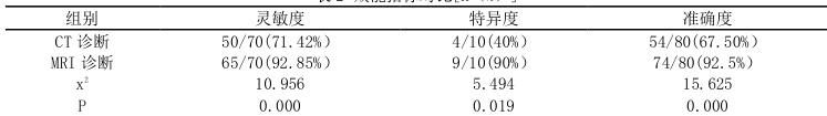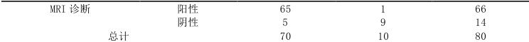 以病理检测结果为金标准,可知阳性70 例、阴性10 例;经CT 诊断,检出阳性56 例、阴性24 例。在MRI诊断中,检出阳性66 例、阴性14 例。见表1。