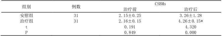治疗前两组无统计学差异 (P>0.05) );治疗后治疗组较安慰组排便频率增多 (P<0.05) ),详见表1