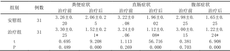 2.2 两组便秘相关症状对比 治疗后治疗组症状评分低, P<0.05 ,详见表2。