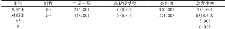 (1)两组的并发症发生情况:气道干燥、鼻粘膜受损、鼻出血等等。