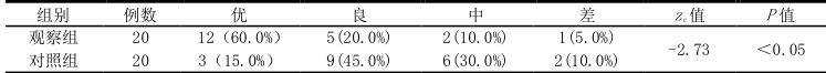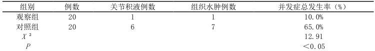 2.1 比较两组患者术后各种并发症发生情况,观察组关节积液1 例,组织水肿1 例,并发症发生率10.0%;对照组关节积液6 例,组织水肿7 例,并发症发生率 65.0%。两组并发症发生率比较差异具有统计学意义 (P< 0.05),观察组优于对照组。