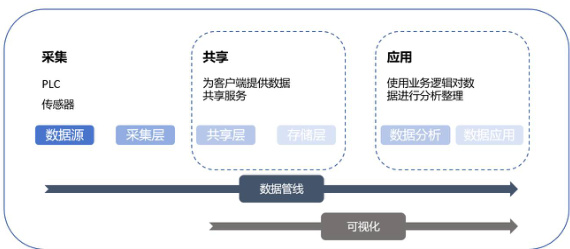 针对上述问题,本文提出了一种由数据采集层、数据共享层和应用层组成的 3 层数据交互架构(图 2)用于提升盾构机中各个模块间的数据交互效率。盾构机工作时采集层会将 PLC 中的实时数据传输至数据共享层,数据共享层是盾构机的数据中枢,在架构中负责数据结构化、协议标准化和多端共享,数据在共享层可以将实时掘进数据通过标准化接口传输给部署于盾构机中的各个应用模块。