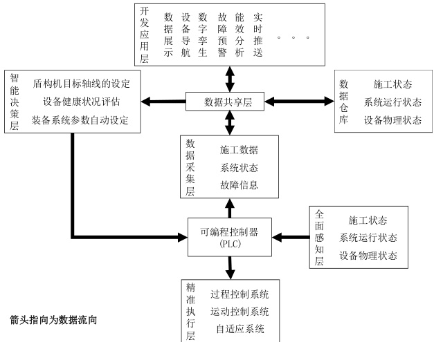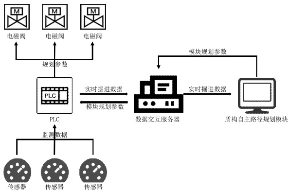 开发应用层通过数据共享层获取实时数据或历史数据,获取的数据在其中可被用于实现目标轴线规划、设备健康评估、地质识别与参数自适应调控等功能。相应模块生成的控制指令或路径规划结果会被传输至PLC 中控制执行部件调整盾构姿态与掘进参数,使盾构机能够连续、自主、高精度的掘进。