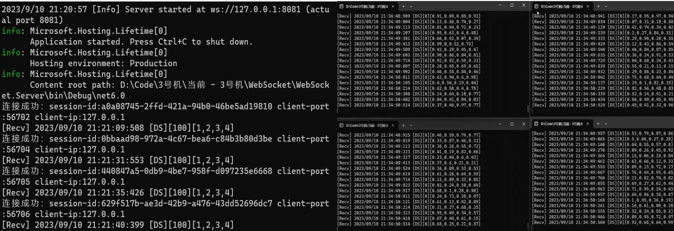 如图 6 所示,上位机部署的数据交互服务启动后,使用 4 个客户端向服务同时发起实时数据订阅请求。在该负载下,服务端能稳定保持每次 100ms 的更新周期向各客户端推送数据,且数据吞吐延迟小于等于 5ms,丢包率为 0。测试结果表明数据交互平台具备多客户端并发处理能力,验证了数据交互平台的实时性与可靠性。