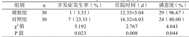 统计并分析 2 组患者并发症情况(腹胀、喉头水肿、压疮)、住院时间及满意度(使用满意度量表进行评估,采用我院自制百分制满意度量表,85 分以上为十分满意, 60~84 分为比较满意,60 分以下为不满意。总满意度为十分满意与比较满意之和)。