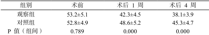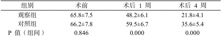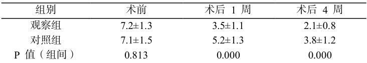 术前两组无差异( P>0.05 );术后 1 周、4 周,两组均显著降低,且观察组低于对照组( P<0.05 )(表 3)。