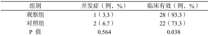 表 4 两组并发症与临床有效率对比(例, % , n=30 )