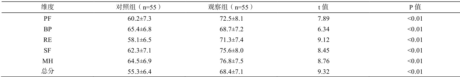 护理后,观察组在生理职能(PF)、情感职能(RE)、社会功能(SF)及精神健康(MH)维度评分显著优于对照组( P<0.05 ),而躯体疼痛(BP)、活力(VT)等维度差异无统计学意义( P>0.05 ,表 1)。护理后,对照组总分为( 55.3±6.4 )分,观察组为( 68.4±7.1 )分,观察组提升幅度显著大于对照组( t=9.32 , P<0.05 ,表 1)。
