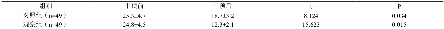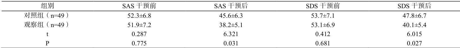 干预前两组 SAS、SDS 评分差异无统计学意义( P>0.05 );干预后观察组 SAS、SDS 评分显著低于对照组( P<0.05 )(表 1)。