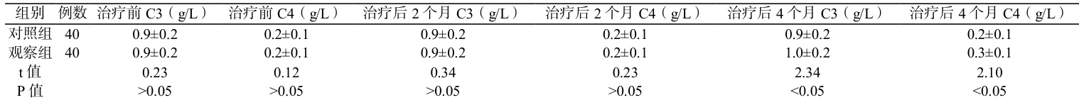 C3、C4 分别表示补体 3、4。治疗后 4 个月,观察组患者的C3、C4 水平均高于对照组,差异有统计学意义( P<0.05 )。见表 1。