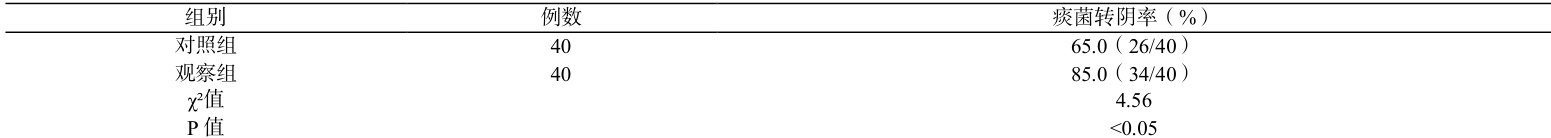痰菌转阴率=(治疗后痰菌阴性例数/每组总例数)×100%。观察组患者的痰菌转阴率高于对照组,差异有统计学意义(P<0.05)。见表2。
