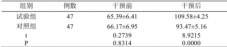 对比表 1 内展示的 ESCA 数据:未干预,差异不显著( P>0.05 );干预后:试验组数据更高( P<0.05 )。