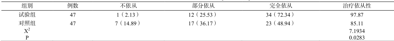 对比表 2 内展示的治疗依从性数据:试验组 97.87% ,对照组 85.11% ,差异显著( P<0.05 )。