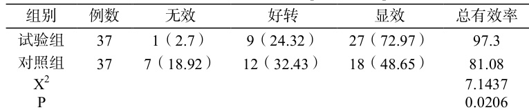 对比表 1 内展示的总有效率数据:试验组 97.3% ,对照组 81.08% ,差异显著( P<0.05 )。