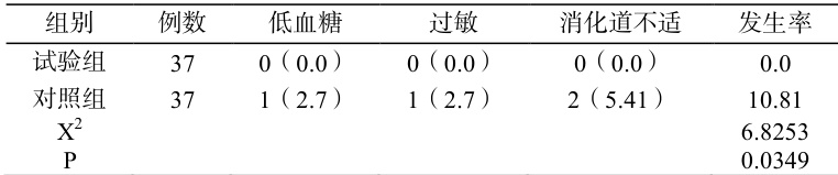 对比表 2 内展示的不良反应数据:试验组 0.0% ,对照组 10.81% ,差异显著( P<0.05 )。