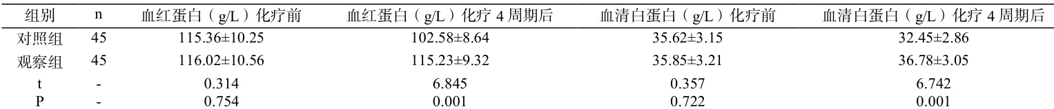 化疗前,两组血红蛋白、血清白蛋白水平对比,差异无统计学意义(P>0.05 );化疗 4 周期后,观察组血红蛋白、血清白蛋白水平均高于对照组,差异有统计学意义( P<0.05 )。见表 1。