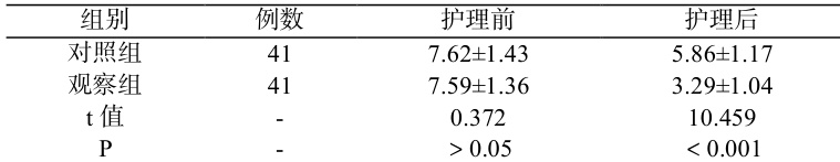 护理后,观察组患者的睡眠质量评分相比对照组明显更低,患者睡眠更好( P<0.05 ),具体数据见表 1: