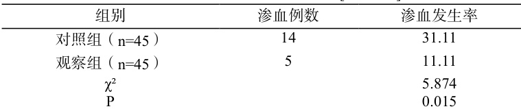 观察组穿刺点渗血发生率低于对照组,差异有统计学意义( P<0.05 ),见表 1。