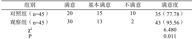 越高,护理满意度越高。根据得分将护理满意度分为满意( ≥40 分)、基本满意(30-39 分)、不满意( <30 分)。护理满意度
