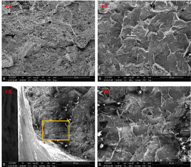 1)从试样断面照片可以看出,试样断口上侧部位色泽较深,断口下侧色泽较浅亮,断面较为平整,有明显的层间断裂特征(A、B、C、D 处),放大如下: