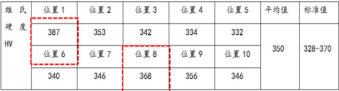 将断裂区划分 10 各位置,进行 HV 硬度检测,结果如下: