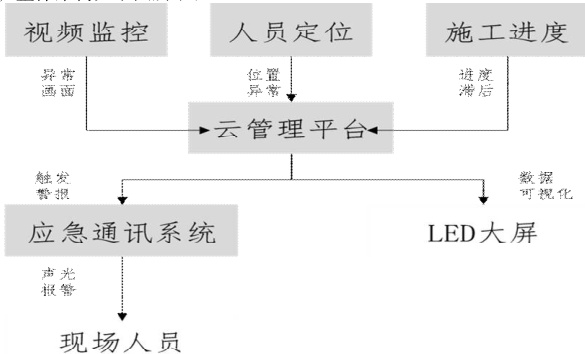系统整体通过视频监控模块、人员定位模块、施工进度模块、应急通讯模块、云管理平台模块以及可视化大屏共同构成 “监测 - 分析 - 预警 - 处置” 的全流程智能化闭环,整体架构如下图所示: