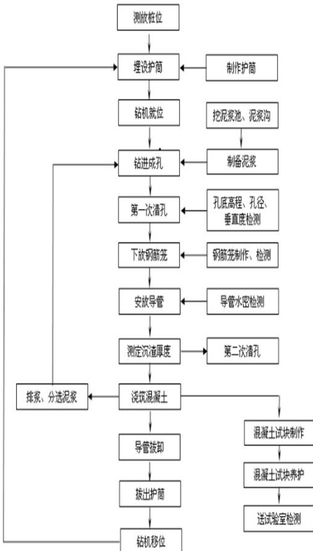 钻孔灌注桩的施工工艺发展至今已经比较成熟,但从其施工流程(图 1)可以看出,钻孔灌注桩的施工环节较多,整个工程施工相对复杂,在实际施工过程中,如果管控不到位,施工操作不当,很容易出现塌孔、断桩等质量问题,给项目带来较大的经济损失或是工期的滞后。所以有必要针对现场实际施工,落实钻孔灌注桩的各项技术要求,规范施工,避免出现质量问题。