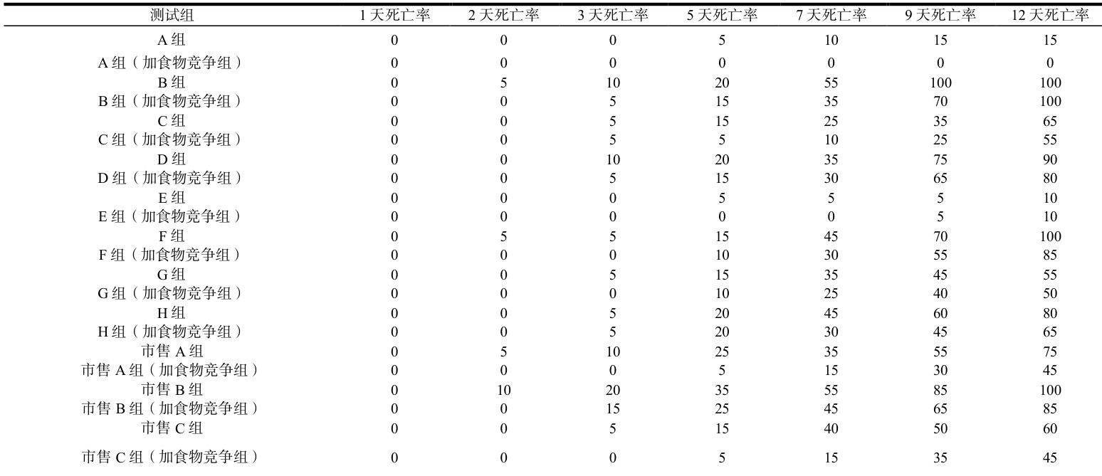 试验采用方箱(长宽高各 700mm )对 20 只蟑螂(德国小蠊 10 日龄,敏感品系)试虫分别进行加食物竞争组( 5% 糖水)和不加食物竞争组(在 25±2∘C ,湿度 60‰ 环境)测试。并对大润发售卖的三种蟑螂饵剂(市售组 A、市售组 B、市售组 C)作了对比测试,分别记录试虫在 1、2、3、5、7、12 天的死亡率数据,得到测试结果如下: