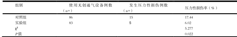 1.3 观察指标 两组早产儿无创通气设备MDRPI的发生率情况比较。 比较两组早产儿无创通气设备MDRPI的发生率,采用SPSS 22.0统计学软件,计数资料采用 Pearson 卡方检验进行统计检验。检验水准α=0.05。经检验,实验组早产儿无创通气设备MDRPI 发生率为6.02%,显著低于对照组的 17.44%,差异具有统计学意义(P<0.05)。