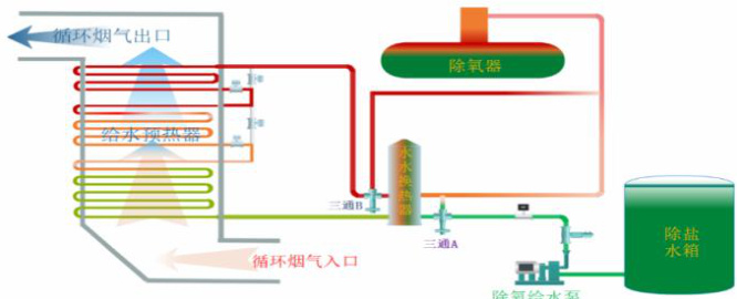(b)当循环风出口温度低于目标温度时,控制系统通过 PID 计算减少分流式电控三通阀 A 的开度,减少进入给水预热器的低温除盐水量,以稳定进入给水预热器的除盐水温度。