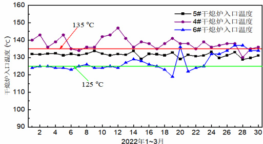 通过与同型 4#、6#干熄炉循环气体入口温度对比(如图 6 所示),5#干熄焦给水预热器在不同负荷下运行情况的分析,结果表明:在不同工况下,通过精细调节给水预热器的进水温度,能够有效控制循环气体在干熄炉入口的温度稳定在 130±5C 。经过自动化改造后的 5#干熄焦给水预热器,其各项主要指标更为稳定,主要温度控制点具有较强的抗外部干扰能力,自动调节范围宽且调节精度高。各主要温度控制点均达到了设计的控制目标,能够很好地避免因生产负荷变化而导致给水预热器运行工况剧烈波动,有效防止了低温区酸露点腐蚀以及过度吸热汽化对给水预热器的冲击,从而有利于给水预热器实现长寿命稳定运行。
