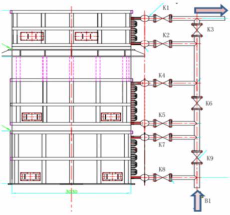 将给水预热器设计成不同换热面积的三段式结构,以满足不同工况下风量条件的运行需求,避免露点腐蚀的发生。这三段既可以单独运行,也可以任意两段组合运行,或者三段同时运行,其结构如图 3 所示。