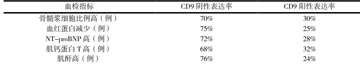 2.CD9 表达和多种临床指标存在明显关系。从表格数据能看到不同血检指标下 CD9 阴性、阳性表达率有差异。例如骨髓浆细胞比例高患者中,CD9 阴性表达率为 30%,阳性表达率是 70%;血红蛋白减少,CD9 阴性表