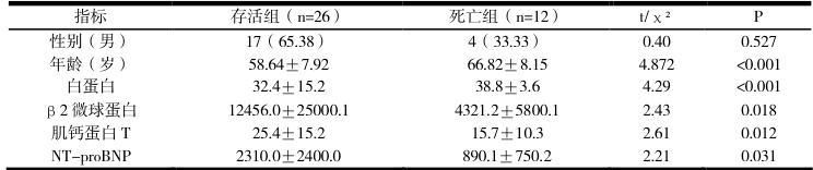 1.根据随访至少一年以上结局将患者分为存活组(26 例)与死亡组(12 例),两组患者基线临床及实验室指标比较见表 2。由表2 可知,死亡组患者年龄、β2 微球蛋白(ug/L)、肌钙蛋白T(ng/L)、NT-proBNP(ng/L)水平显著高于存活组,白蛋白(g/L)水平显著低于存活组,差异均具有统计学意义(P<0.05);两组患者性别患病率比较,差异无统计学意义(P>0.05)。