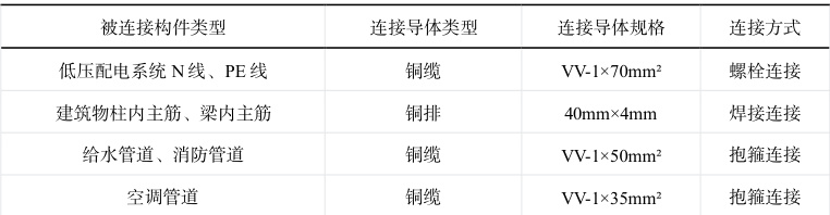 总等电位连通接口板于地下一层低压配电室设置,总等电位连通接口板用铜板制造,其规格 200mm×100mm×8mm ,其中预留不少于 20 个插座。采用 4 根 VV- lx95mm2 铜导线将总等电位连通接口板与基本接地极有效连接,使其接地电阻≤1Ω。针对建筑内低压配电系统内所有中性线(n 线)、保护接地线(pe 线)、建筑金属装置、金属管线等均需与总等电位联接端子板间进行联结,因此选用铜缆或铜排作为联结导体,具体规格按被联结构件截面积的大小确定,详见表 1